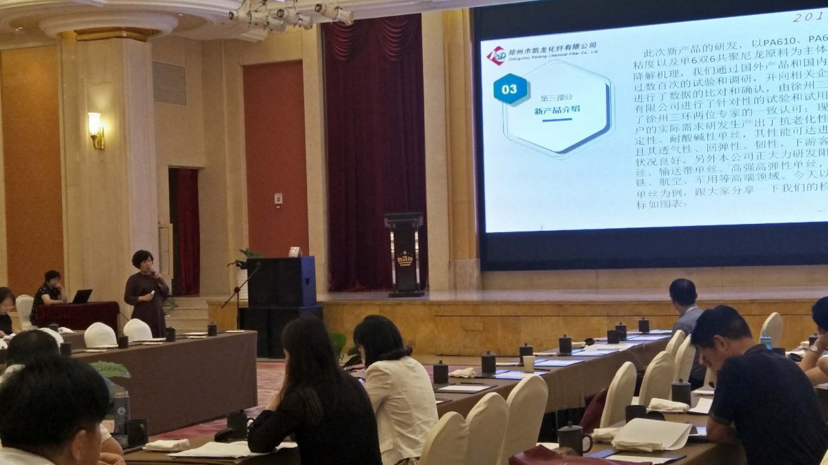 三、由鄭州市凱龍化纖有限公司郭松芹總經(jīng)理發(fā)表了以優(yōu)質(zhì)錦綸單絲的 研發(fā)與應(yīng)用的講話